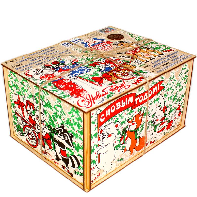 Сладкий подарок на Новый Год в упаковке из фанеры весом 1850 грамм