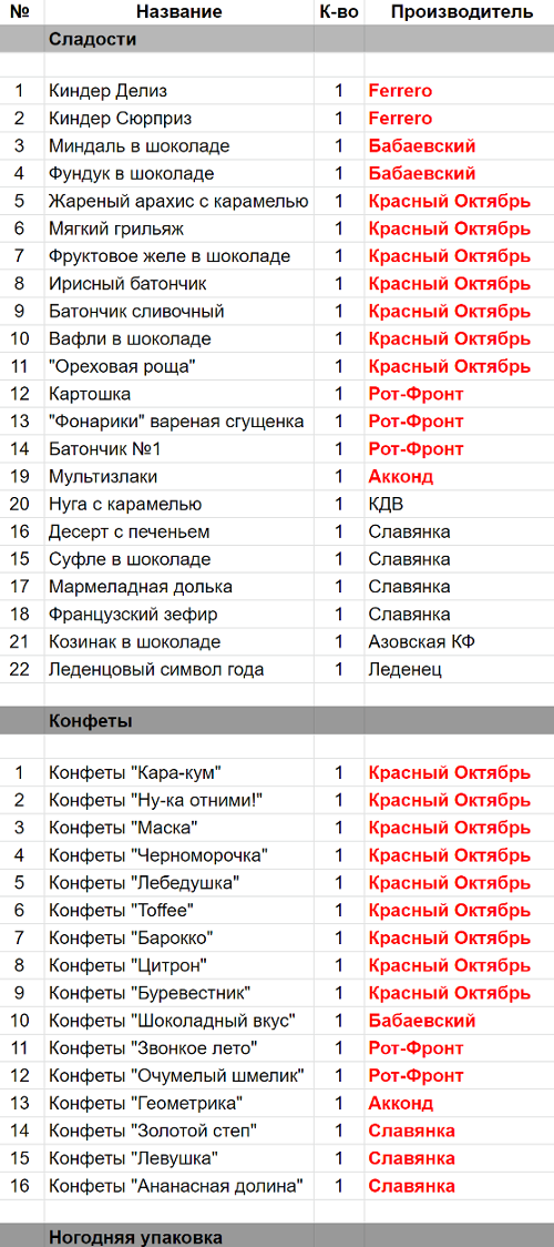 Жареный арахис с карамелью (1 шт), Мягкий грильяж (1 шт), Фруктовое желе в шоколаде (1 шт), Ирисный батончик (1 шт), Батончик сливочный (1 шт), Вафли в шоколаде (1 шт), "Ореховая роща" (1 шт), Конфеты "Кара-кум" (1 шт), Конфеты "Ну-ка отними!" (1 шт), Конфеты "Маска" (1 шт), Конфеты "Черноморочка" (1 шт), Конфеты "Лебедушка" (1 шт), Конфеты "Toffee" (1 шт), Конфеты "Барокко" (1 шт), Конфеты "Цитрон" (1 шт), Конфеты "Буревестник" (1 шт)