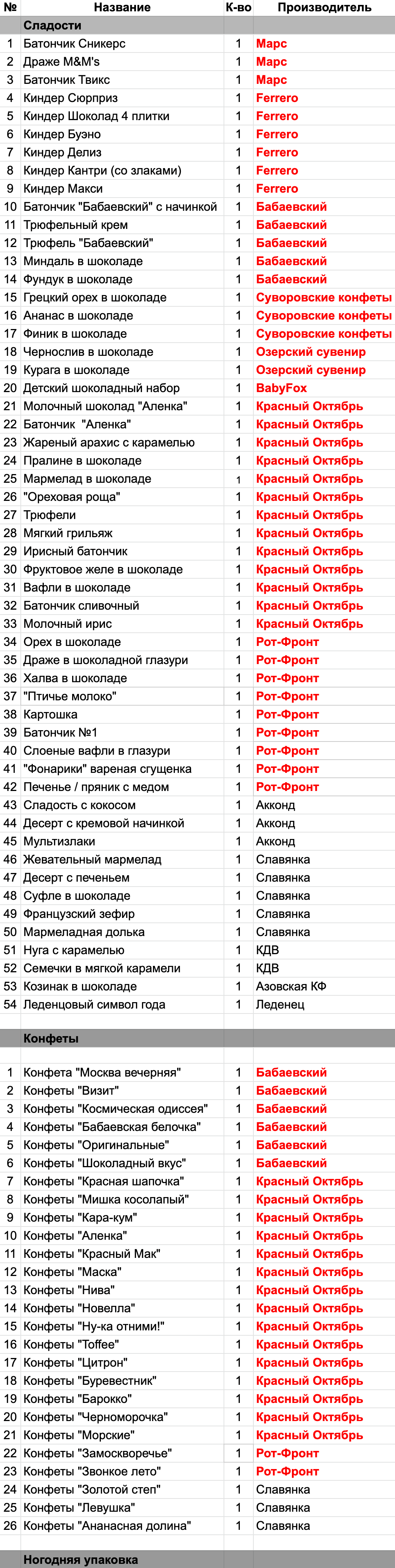 Молочный шоколад "Аленка" (1 шт), Батончик  "Аленка" (1 шт), Жареный арахис с карамелью (1 шт), Мармелад в шоколаде (1 шт), "Ореховая роща" (1 шт), Трюфели (1 шт), Мягкий грильяж (1 шт), Ирисный батончик (1 шт), Фруктовое желе в шоколаде (1 шт), Вафли в шоколаде (1 шт), Батончик сливочный (1 шт), Молочный ирис (1 шт), Конфеты "Красная шапочка" (1 шт), Конфеты "Мишка косолапый" (1 шт), Конфеты "Кара-кум" (1 шт), Конфеты "Аленка" (1 шт), Конфеты "Красный Мак" (1 шт), Конфеты "Маска" (1 шт), Конфеты "Нива" (1 шт), Конфеты "Петушок" (1 шт), Конфеты "Ну-ка отними!" (1 шт), Конфеты "Toffee" (1 шт), Конфеты "Мама приехала" (1 шт), Конфеты "Цитрон" (1 шт), Конфеты "Буревестник" (1 шт), Конфеты "Барокко" (1 шт), Конфеты "Черноморочка" (1 шт), Конфеты "Морские" (1 шт)