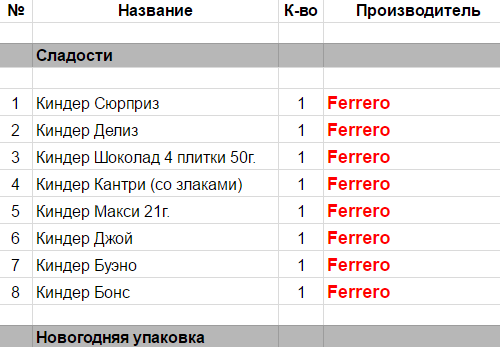 Киндер Сюрприз (1 шт), Киндер Джой (1 шт), Киндер Делис (1 шт), Киндер Шоколад 4 плиток 50г.(1 шт), Киндер Кантри (со злаками) (1 шт), Киндер Макси 21 г. (1 шт), Киндер Буэно (1 шт), Киндер Бонс (1 шт)